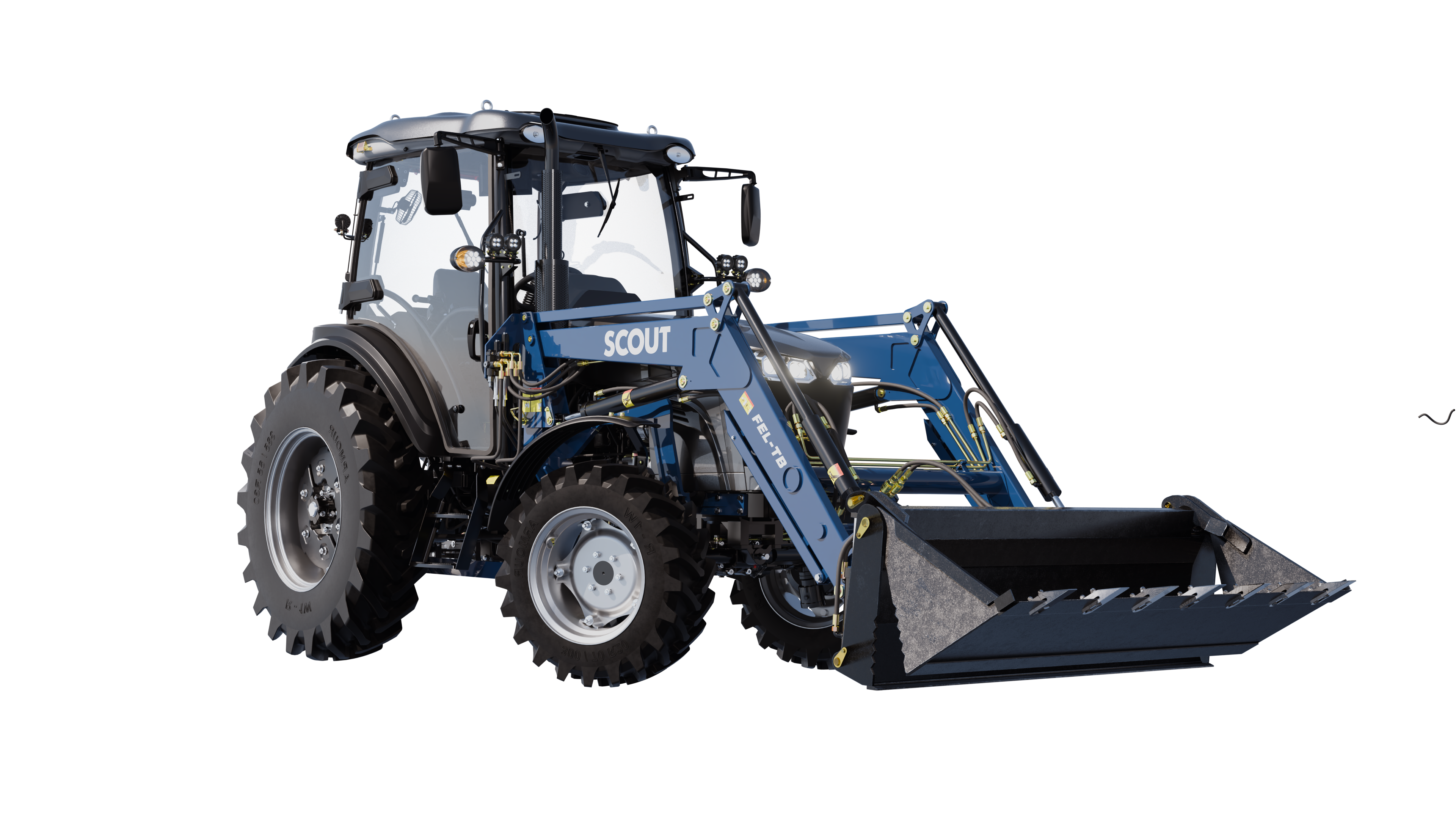SCOUT FEL-TB — универсальный помощник для сельхоз-, коммунальных и строительных работ. В базовой комплектации идёт челюстной ковш, а далее можно использовать сменное оборудование под разные задачи: паллетные вилы, отвалы, снегоуборщик и другие виды навески.